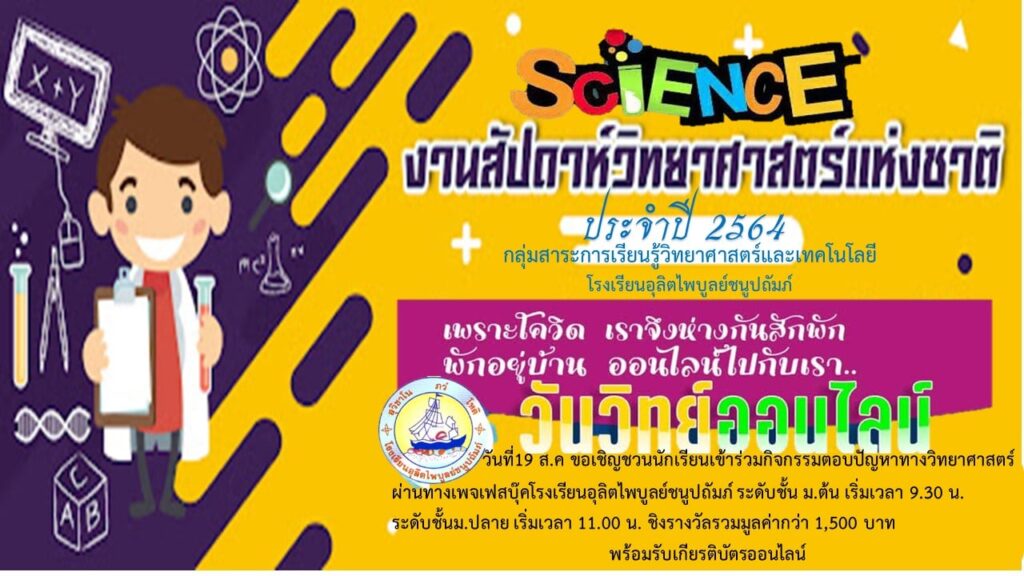 วันที่19 ส.ค ขอเชิญชวนนักเรียนเข้าร่วมกิจกรรมตอบปัญหาทางวิทยาศาสตร์ ผ่านทางเพจเฟสบุ๊คโรงเรียนอุลิตไพบูลย์ชนูปถัมภ์ ระดับชั้น ม.ต้น เริ่มเวลา 9.30 น. ระดับชั้นม.ปลาย เริ่มเวลา 11.00 น. ชิงรางวัลรวมมูลค่ากว่า 1,500 บาทพร้อมรับเกียรติบัตรออนไลน์