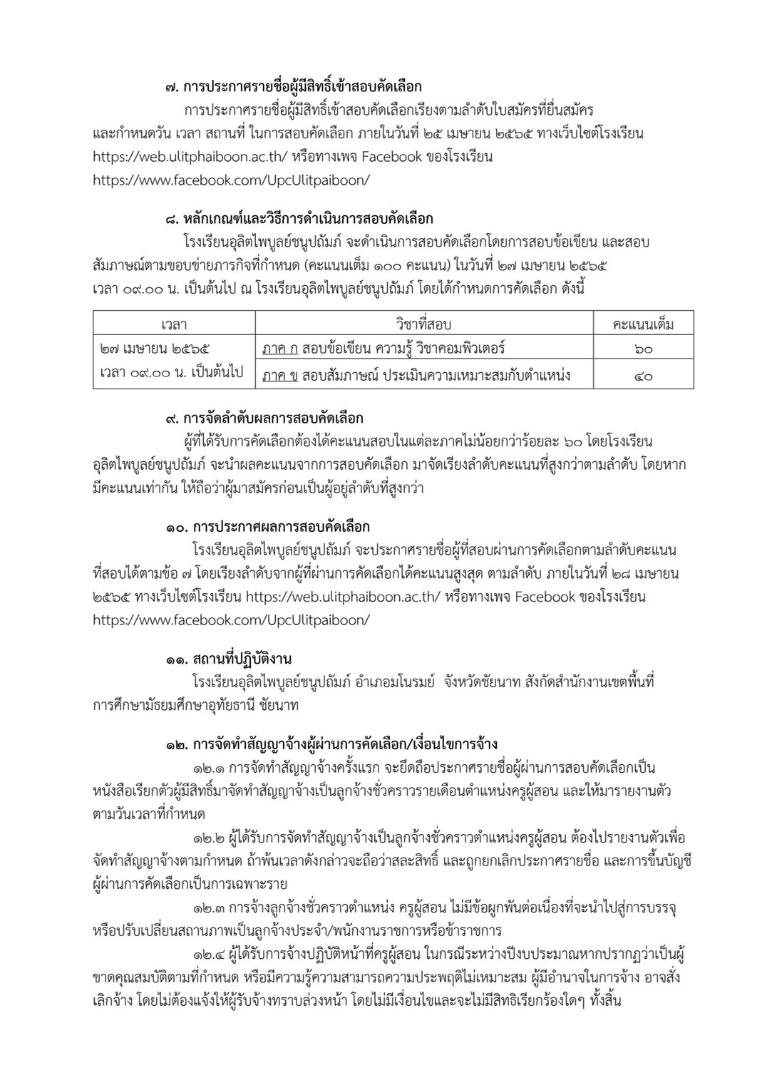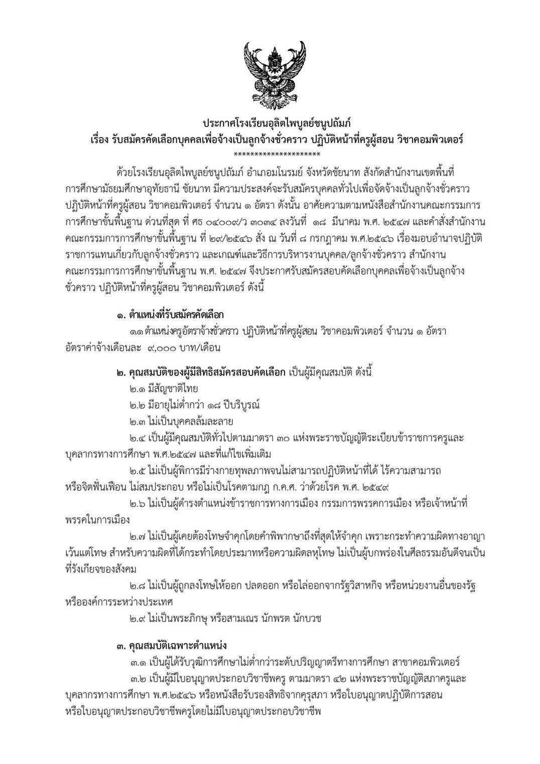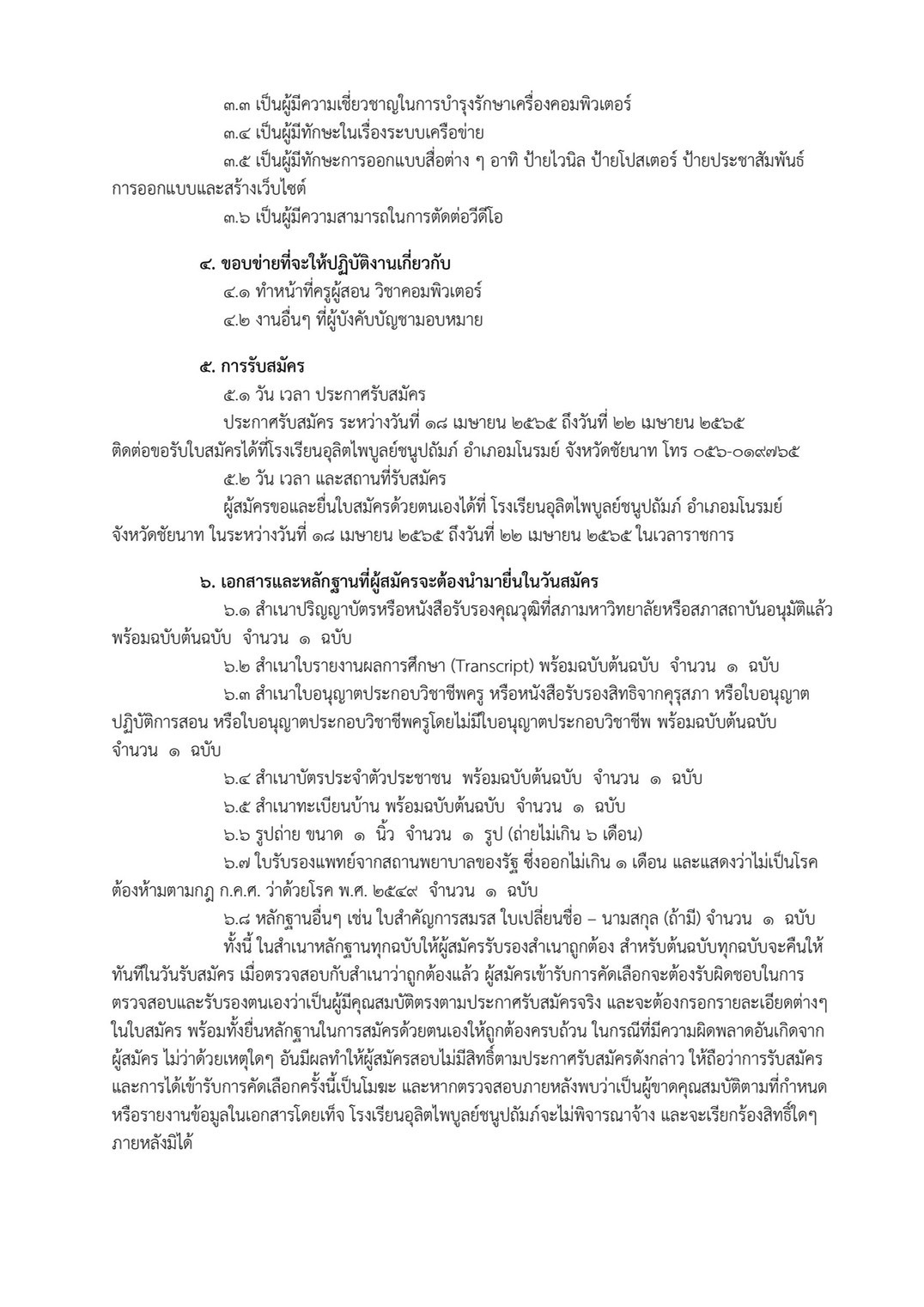 ประกาศรับสมัครครูอัตราจ้าง วิชาคอมพิวเตอร์ จำนวน 1 อัตรา 9,000 บาท/เดือน 17 เม.ย. 2565ครูหนุงหนิง ดอทคอมข่าวสารโรงเรียน, ประกาศ โรงเรียนอุลิตไพบูลย์ชนูปถัมภ์ เปิดรับสมัครครูอัตราจ้างสอนรายวิชาคอมพิวเตอร์ จำนวน 1 อัตรา รับสมัครตั้งแต่วันที่ 18-22 เมษายน 2565 ยื่นใบสมัครด้วยตนเองที่โรงเรียนอุลิตไพบูลย์ชนูปถัมภ์ คุณสมบัติและรายละเอียดดังเอกสารแนบ จำนวนคนดู: 13