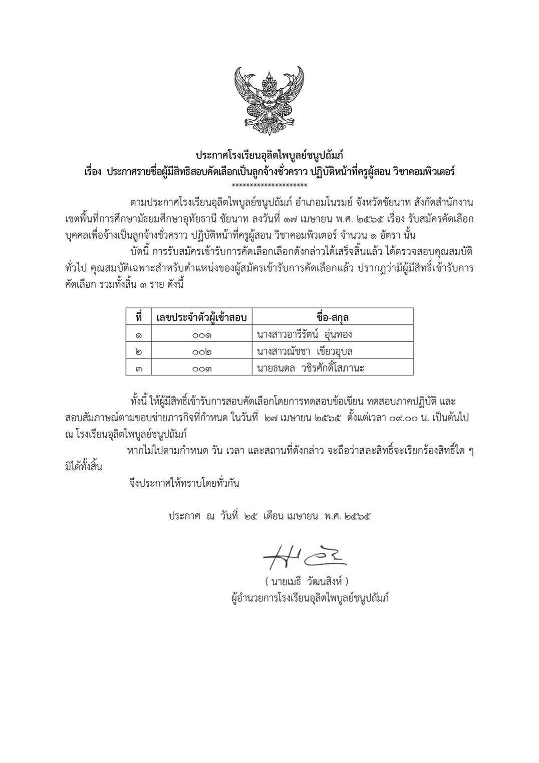 ประกาศโรงเรียนอุลิตไพบูลย์ชนูปถัมภ์ เรื่อง ประกาศรายชื่อผู้มีสิทธิ์สอบคัดเลือกเป็นลูกจ้างชั่วคราว ปฏิบัติหน้าที่ครูผู้สอน วิชาคอมพิวเตอร์ ให้ผู้มีรายชื่อดังประกาศเข้ารับการสอบคัดเลือกโดยการทดสอบข้อเขียน ทดสอบภาคปฏิบัติ และสอบสัมภาษณ์ตามขอบข่ายภารกิจที่กำหนด ในวันที่ 27 เมษายน 2565 ตั้งแต่เวลา 09.00 น. เป็นต้นไป ณ โรงเรียนอุลิตไพบูลย์ชนูปถัมภ์