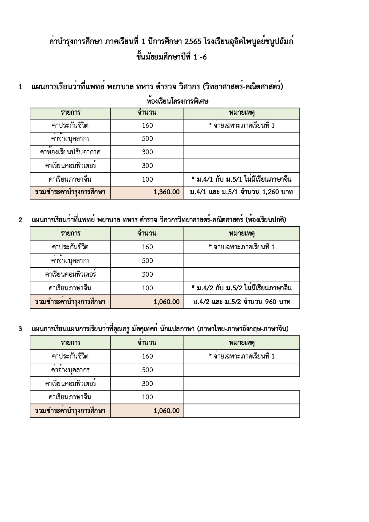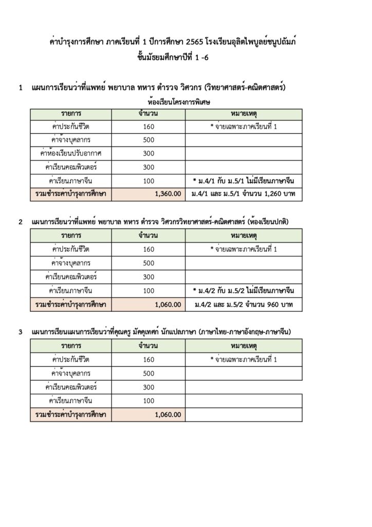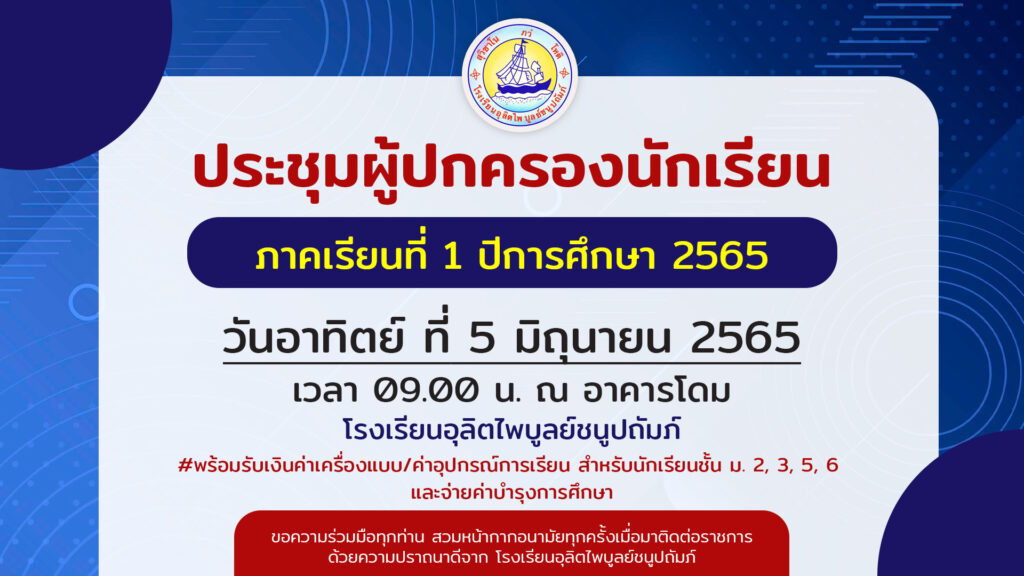 ประชาสัมพันธ์ โรงเรียนอุลิตไพบูลย์ชนูปถัมภ์ จัดประชุมผู้ปกครอง ประจำปีการศึกษา 2565 ในวันอาทิตย์ที่ 5 มิถุนายน 2565 ณ อาคารโดม พร้อมทั้งแจกค่าเครื่องแบบ และค่าอุปกรณ์การเรียน ให้นักเรียนชั้นมัธยมศึกษาปีที่ 2, 3, 5, 6 และจ่ายค่าบำรุงการศึกษา ผู้ปกครองสามารถตรวจสอบค่าบำรุงการศึกษาได้ตาม ตารางค่าใช้จ่ายที่แนบ (ตรวจสอบตามแผนการเรียนที่นักเรียนลงทะเบียนเรียน)