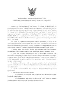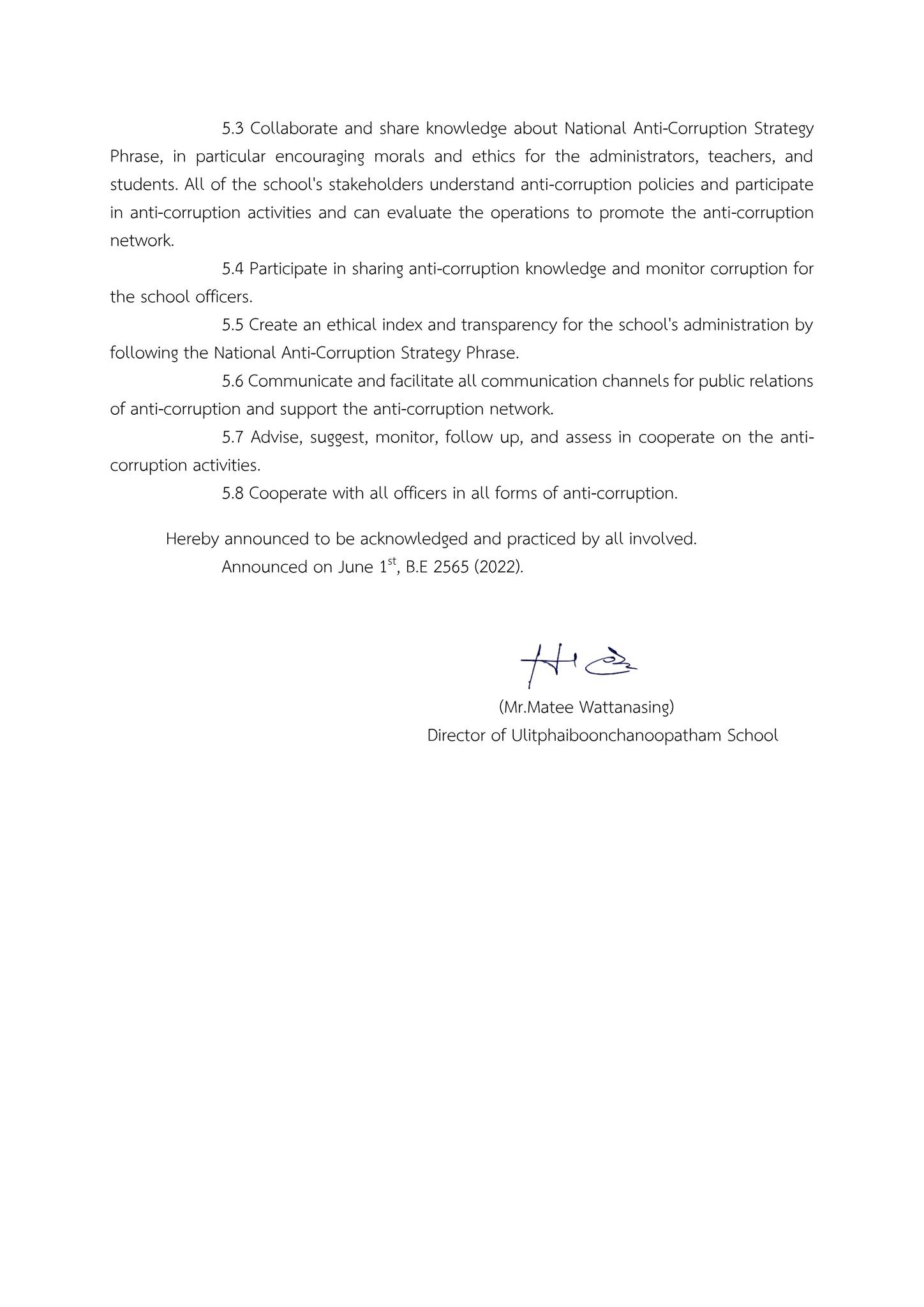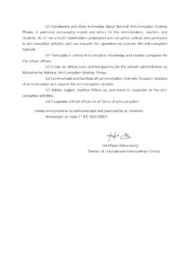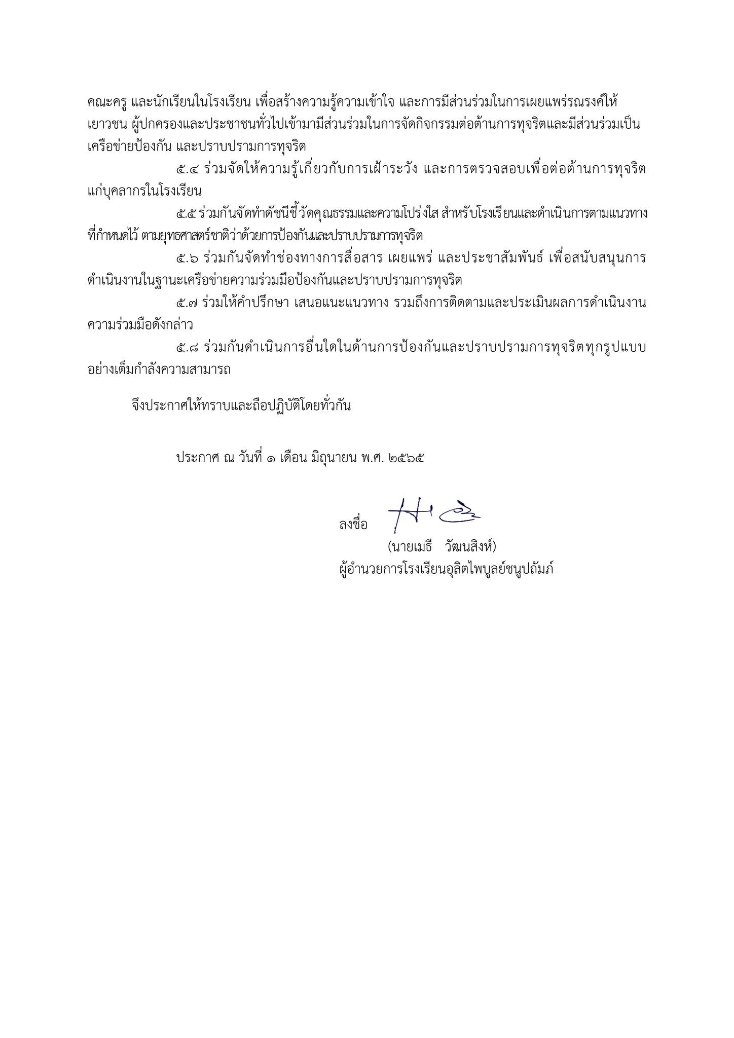 ผู้บริหาร คณะครูบุคลากรทางการศึกษาและนักเรียนโรงเรียนอุลิตไพบูลย์ชนูปถัมภ์รวมพลังต่อต้านคอร์รัปชั่น โดยการประกาศเจตจำนงสุจริตในการบริหารงานของโรงเรียนและจัดการเรียนการสอนหลักสูตรโรงเรียนสุจริตด้วยการบูรณาการในทุกกลุ่มสาระการเรียนรู้