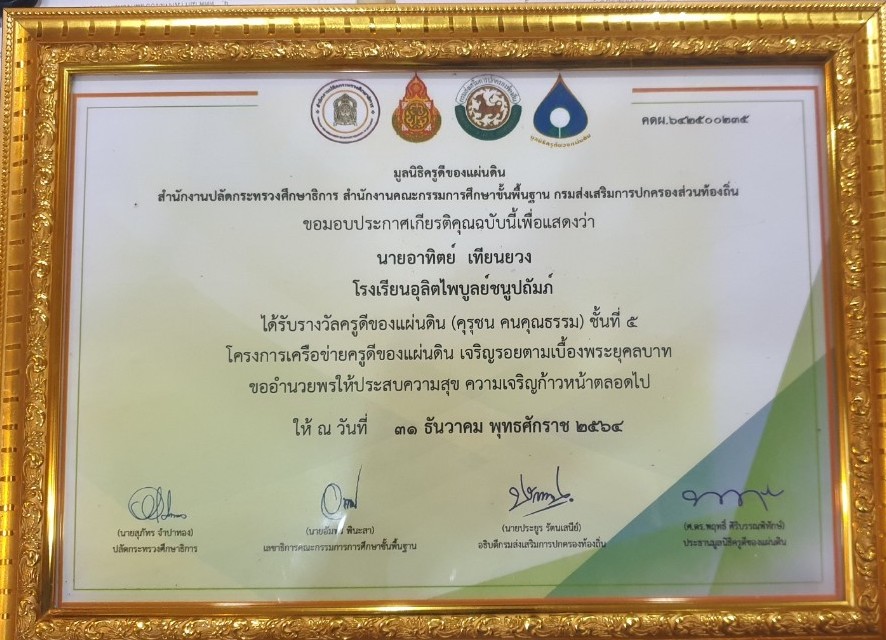แสดงความยินดีกับคุณครูอาทิตย์ เทียนยวง ได้รับรางวัลครูที่ของแผ่นดิน (ครุชน คนคุณธรรม) ชั้นที่ ๕ โครงการเครือข่ายครูของแผ่นดิน เจริญรอยตามเบื้องพยุคลบาท