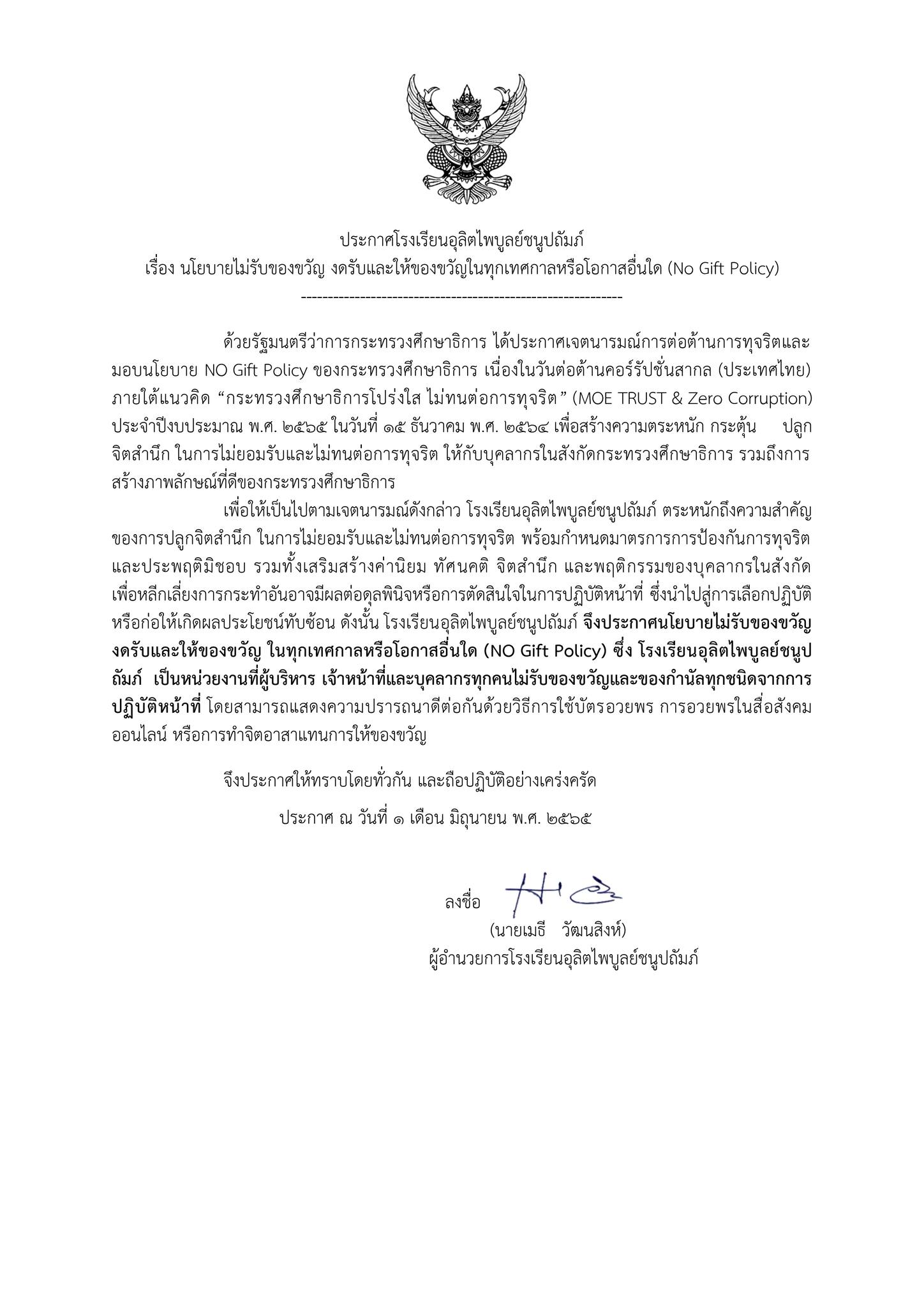 โรงเรียนอุลิตไพบูลย์ชนูปถัมภ์ประกาศ No Gife Policy งดรับ งดให้ของขวัญ เพื่อร่วมกันป้องกันและแก้ไขปัญหาการทุจริต 3 ต.ค. 2565ครูอารีรัตน์ อุ่นทองข่าวสารโรงเรียน, ประกาศ โรงเรียนอุลิตไพบูลย์ชนูปถัมภ์ประกาศ No Gife Policy งดรับ งดให้ของขวัญ เพื่อร่วมกันป้องกันและแก้ไขปัญหาการทุจริต อ่านเพิ่มเติม………… จำนวนคนดู: 4