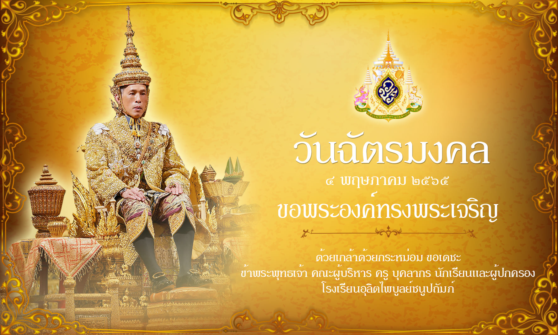 ๔ พฤษภาคม ๒๕๖๕ วันฉัตรมงคล ขอพระองค์ทรงพระเจริญ ด้วยเกล้าด้วยกระหม่อม ขอเดชะ ข้าพระพุทธเจ้า คณะผู้บริหาร ครู บุคลากร นักเรียนและผู้ปกครอง โรงเรียนอุลิตไพบูลย์ชนูปถัมภ์